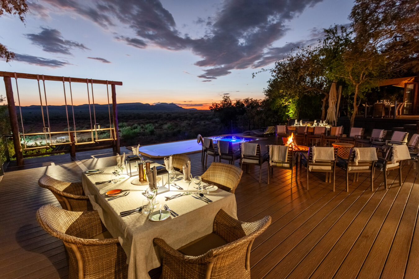 Madikwe Hills offers an exclusive safari experience for up to 24 guests in 10 spacious, glass-fronted suites, each secluded and linked by wooden walkways winding through Tamboti trees. Set on a hillside overlooking a waterhole, the lodge also features Little Madikwe, a private 2-bedroom villa ideal for families or small groups. The central area includes a lounge, bar, wine cellar, dining space, and pool deck. Suites come with private plunge pools and panoramic bush views, while the villa includes its own game vehicle, guide, chef, and house attendant. Children over 10 are welcome at the main lodge; all ages are welcome in the villa.