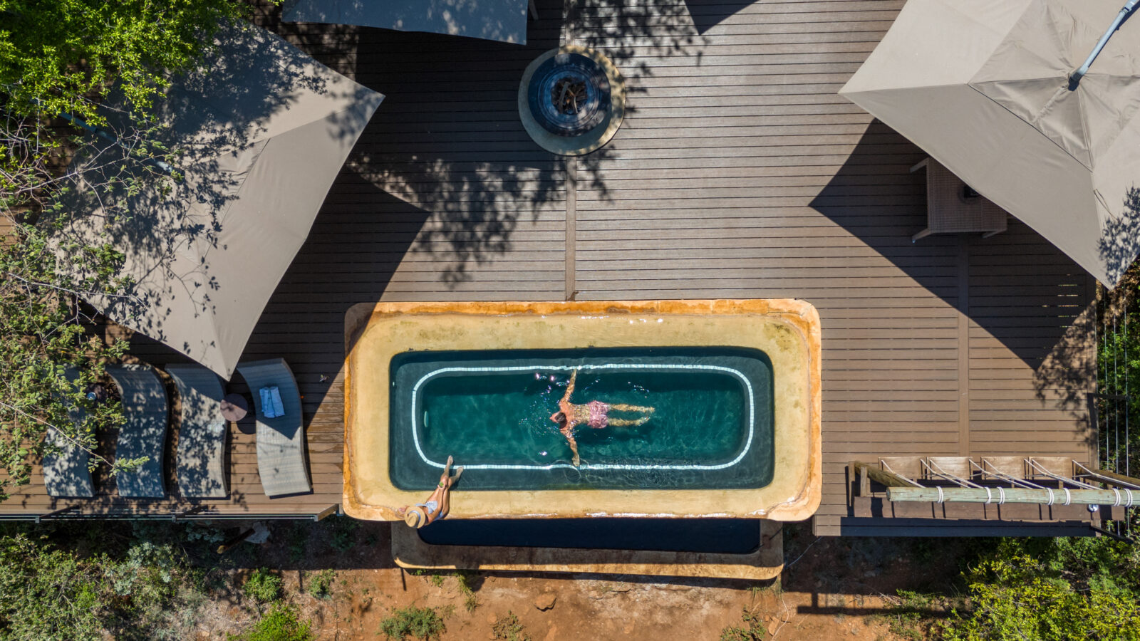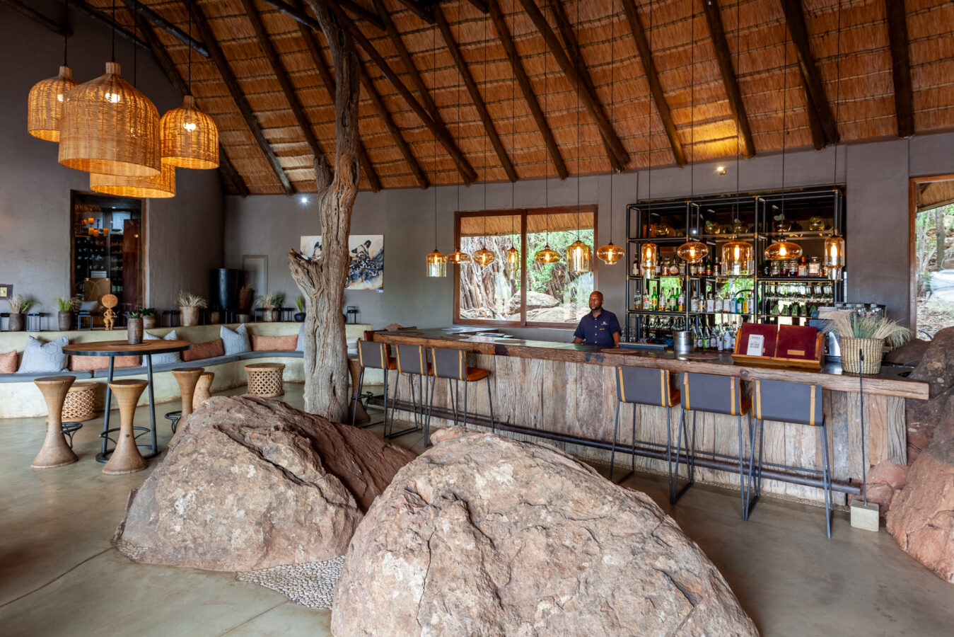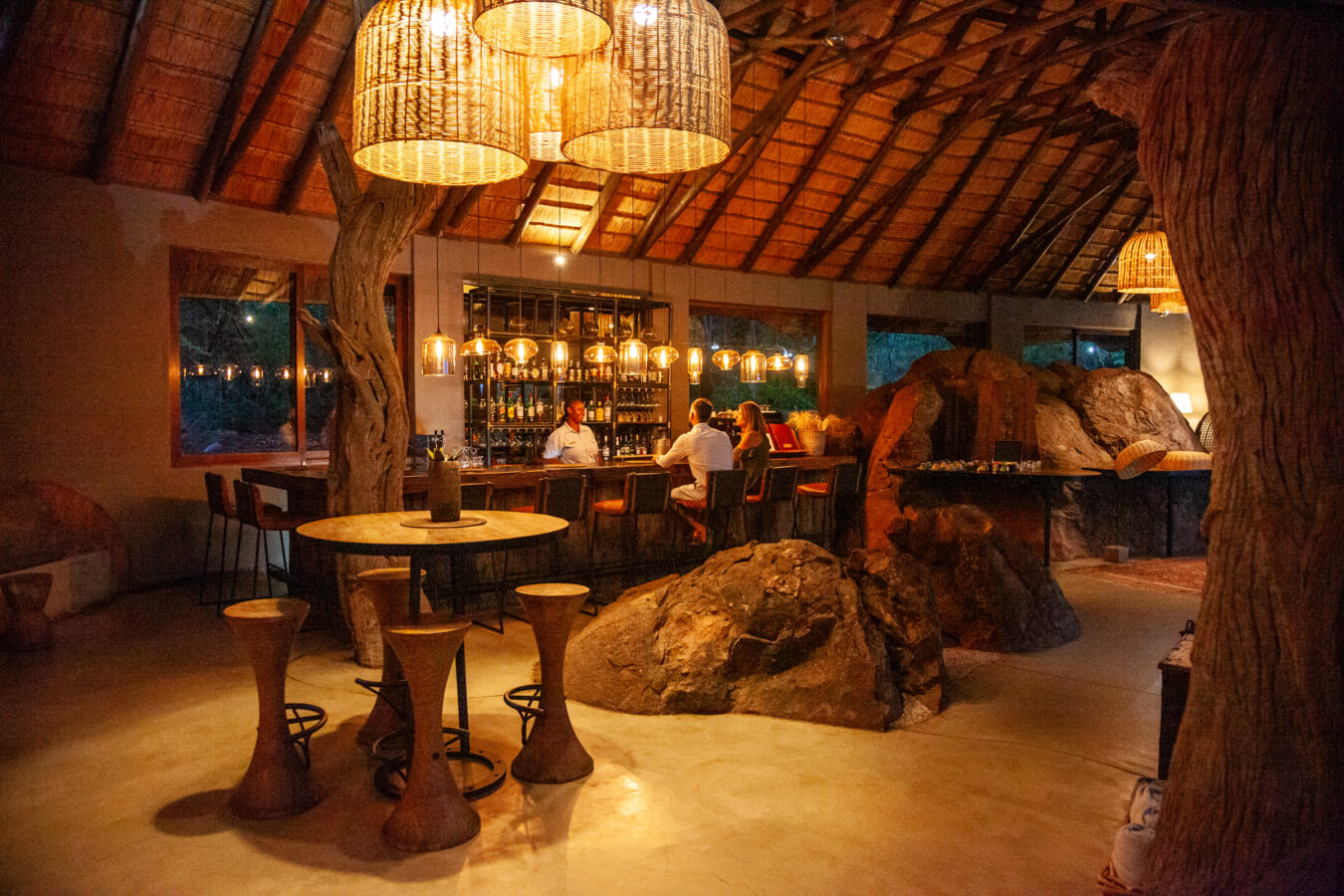 Accommodating up to 24 guests in expansive, well-spaced and totally private glass-fronted suites scattered across the hillside, camouflaged by tamboti trees and thatch roofs. Wooden walkways lit by hurricane lamps criss-cross the grounds and connect the secluded suites to the central open-plan lounge, bar, wine cellar, TV room and dining area up the slope, where cooling fans make slow rotations and the giant twisted trunks of leadwood trees hold up the vaulted ceiling.